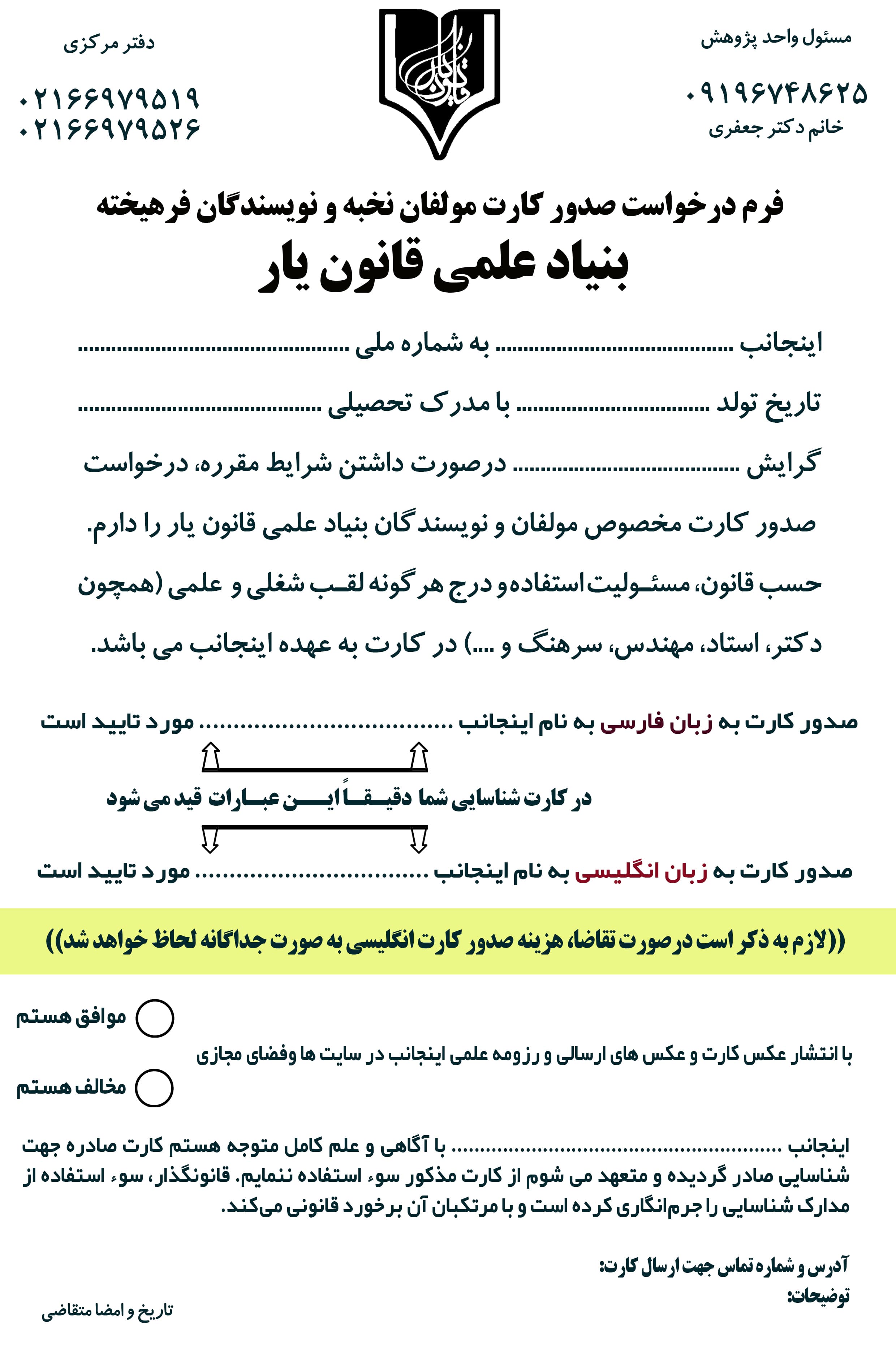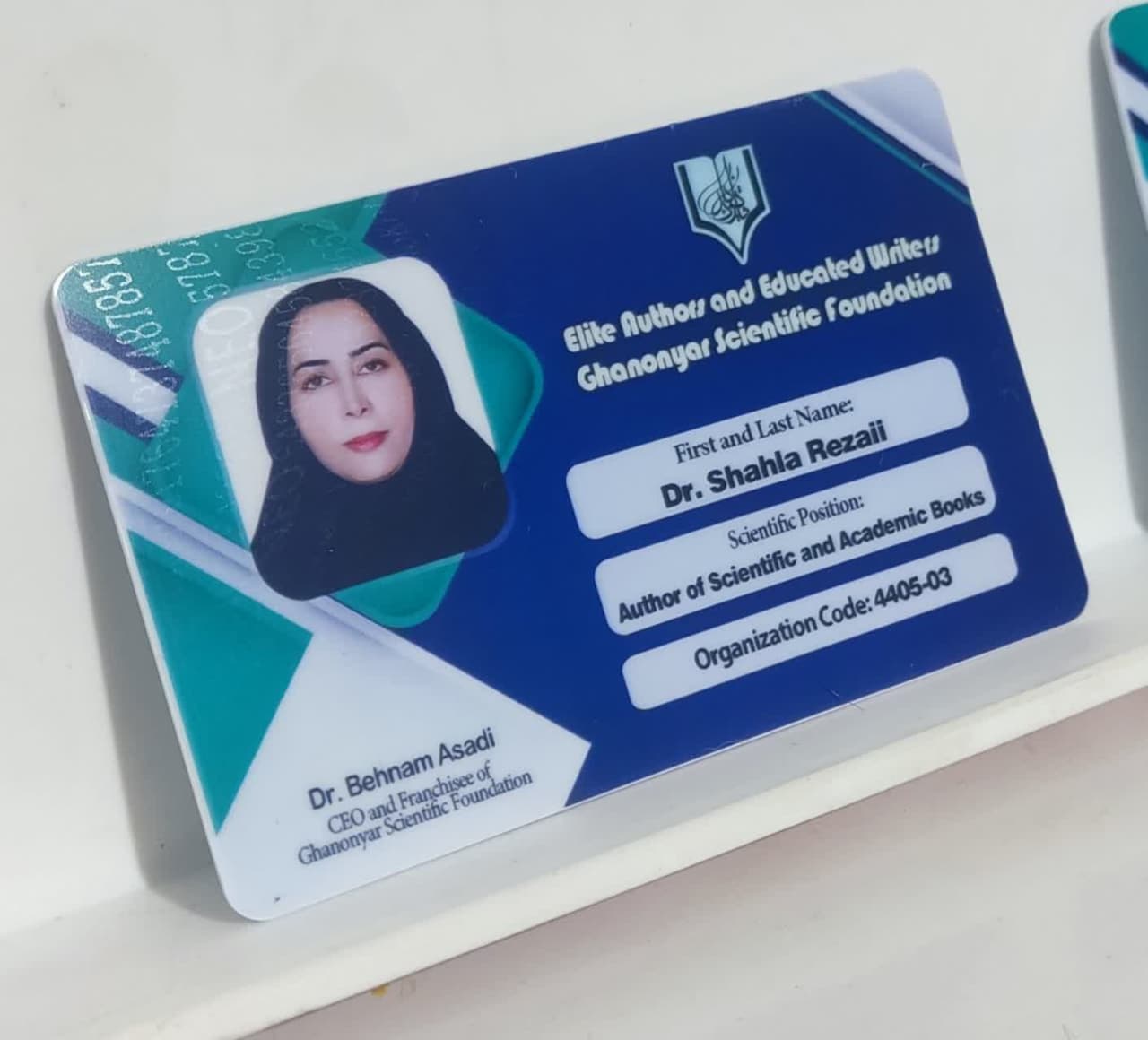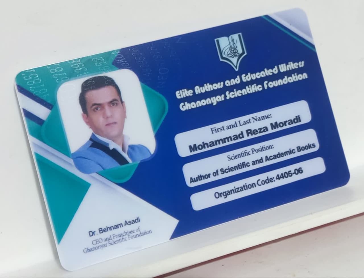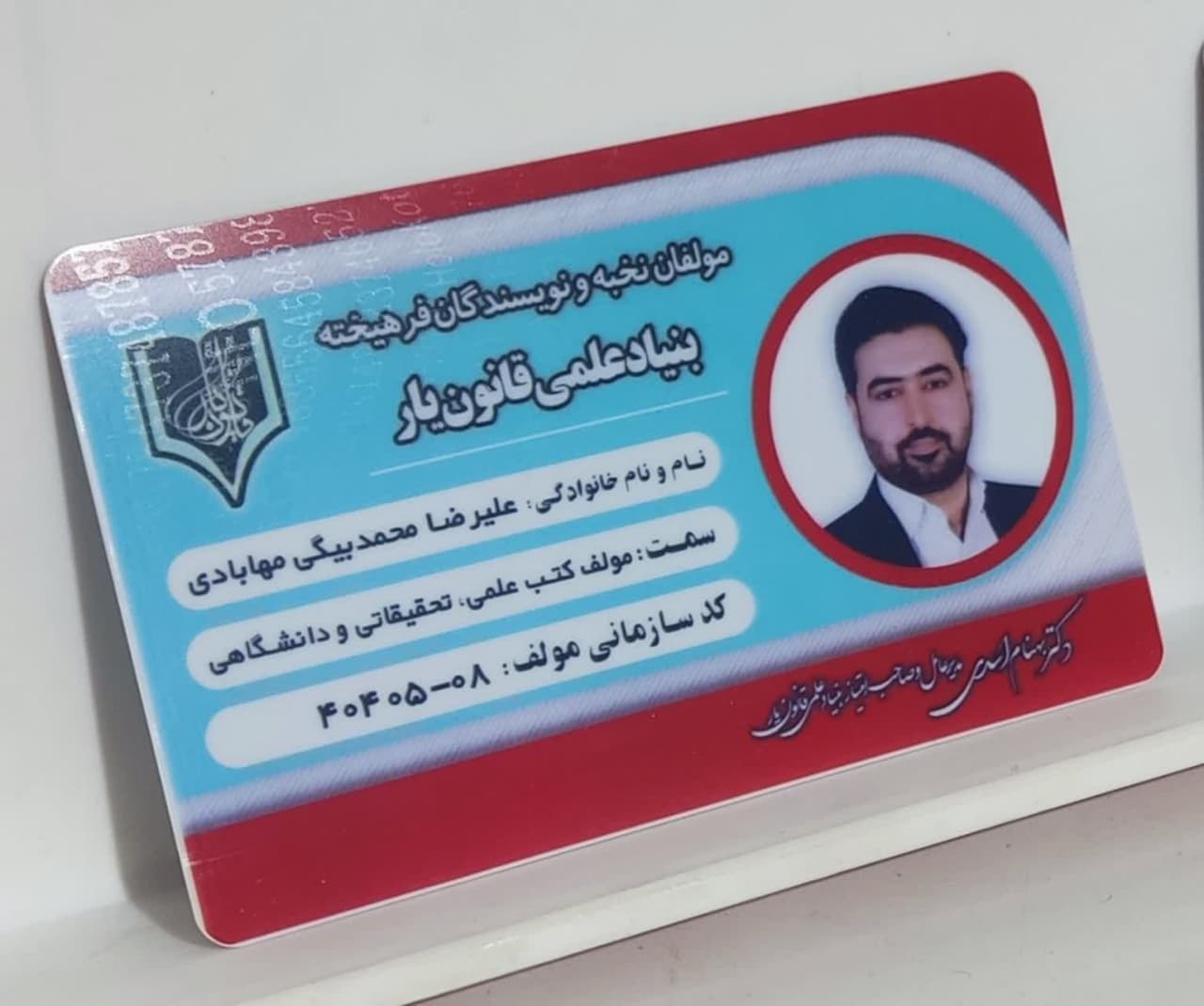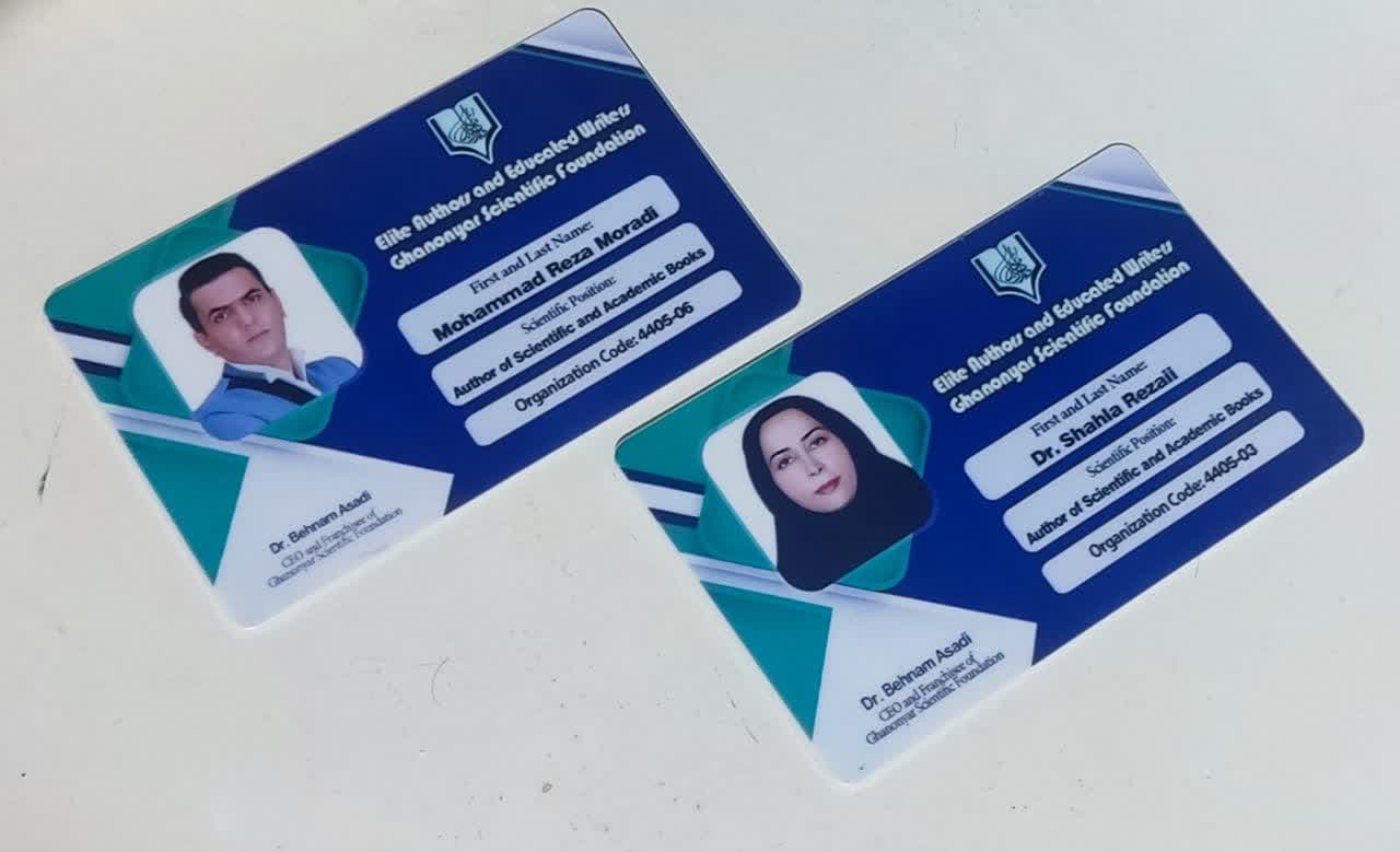 کارت شناسایی اهل قلم قانون یار (مخصوص مولفان نخبه بنیاد علمی قانون یار) به دو زبان فارسی و انگلیسی (با بهترین کیفیت) کارت پی وی سی